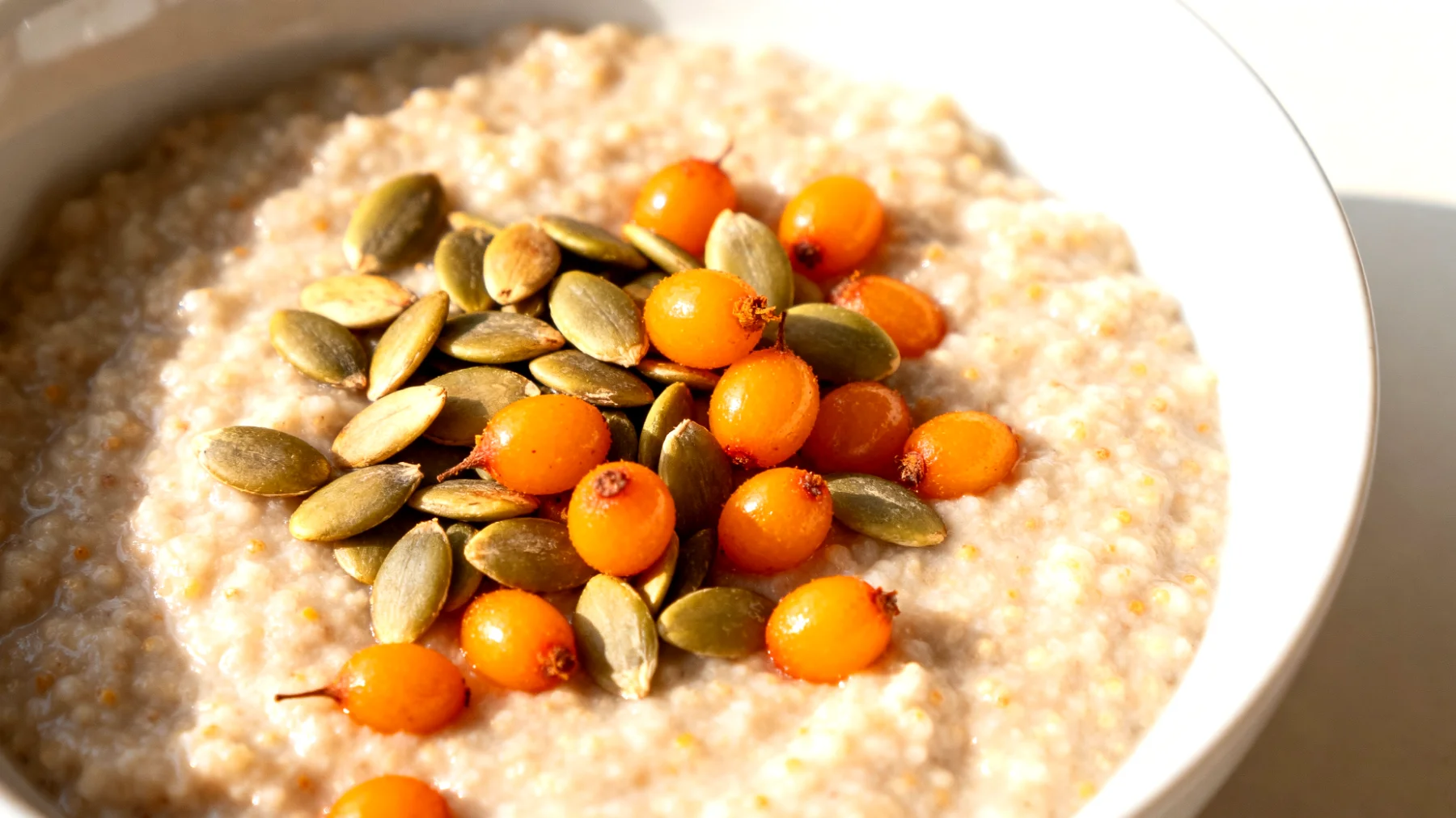 Die Kürbiskerne werden ohne Fett in einer Pfanne geröstet, bis sie duften und leicht aufplatzen. Sanddornbeeren gibt es frisch, gefroren oder als Saft – bei Saft auf ungezuckerte Varianten achten. Wer gefrorene Beeren verwendet, kann sie direkt über das warme Porridge geben, wo sie leicht antauen und ihre volle Aromakraft entfalten.