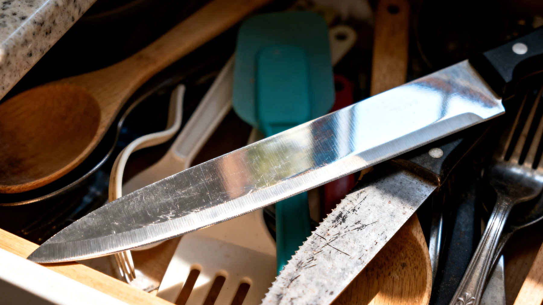 Die Klinge eines Messers besteht typischerweise aus gehärtetem Stahl mit einer mikrofeinen Schneidkante. Diese Zone ist nur wenige Mikrometer breit und bleibt durch gezielte Schleifwinkel stabil, solange sie keine mechanischen Stöße abbekommt. In einer unstrukturierten Schublade stoßen Messer bei jeder Bewegung aneinander. Die Schläge erzeugen winzige plastische Verformungen entlang der Schneide. Besonders kritisch ist das beim Ein- und Ausräumen der Besteckschublade: der Moment, in dem die Klingen unkontrolliert aufeinandertreffen.